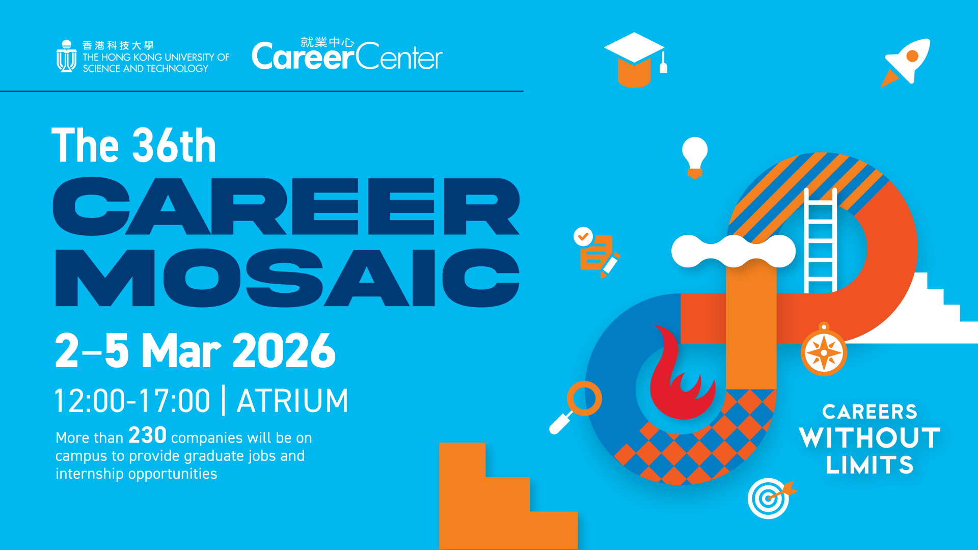 The HKUST Career Mosaic (Career Fair) will be held on 2-5 March in the Atrium. Over 230 companies from various industries will be on campus to interact with students. Come join us and meet your prospective employers!