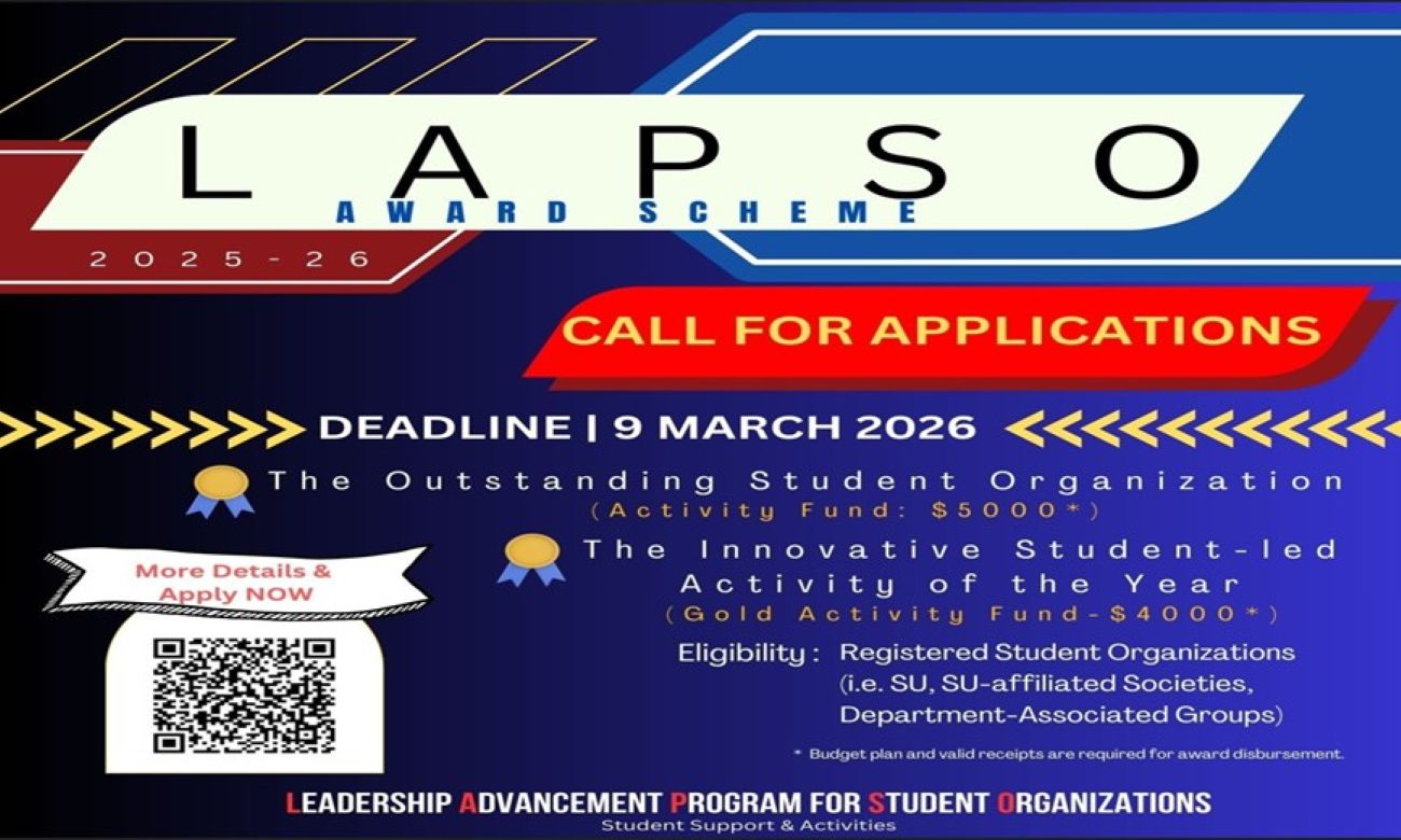 We are pleased to announce the call for applications for the Leadership Advancement Program for Student Organizations (LAPSO) Award Scheme 2025-26 opens now. This award scheme aims to recognize and celebrate student organizations that demonstrate outstanding management, creativity, innovation, and a positive impact on the university or the community.Eligibility: Registered Student Organizations (i.e. SU, SU-affiliated Societies, Department-associated Groups)To apply for the award, please read through the application guidelines for details. Applicants need to complete an online application form for The Outstanding Student Organization /  The Innovative Student-led Activity of the Year and attach supplementary materials by 9 March 2026. Shortlisted applicants will be invited to give a presentation and answer questions from the selection panel. Don’t miss out this opportunity to demonstrate the achievements you’ve made and receive funding to support your activities! Should you have any questions, please contact us at ssa@ust.hk or 2358-6658.